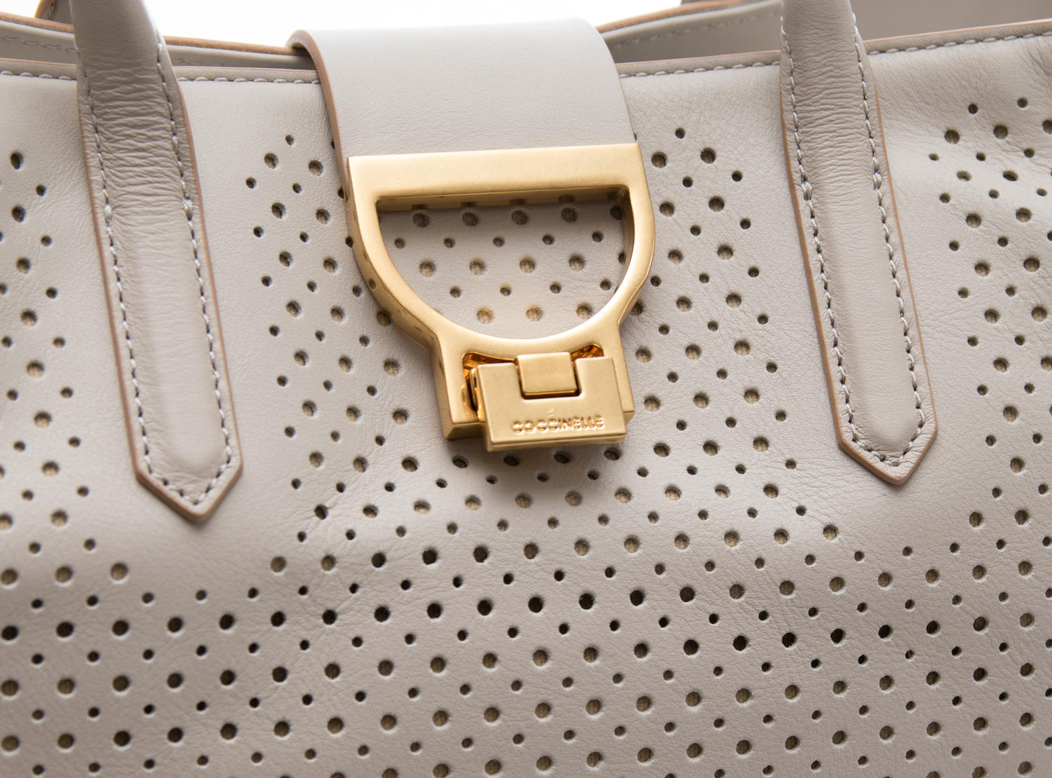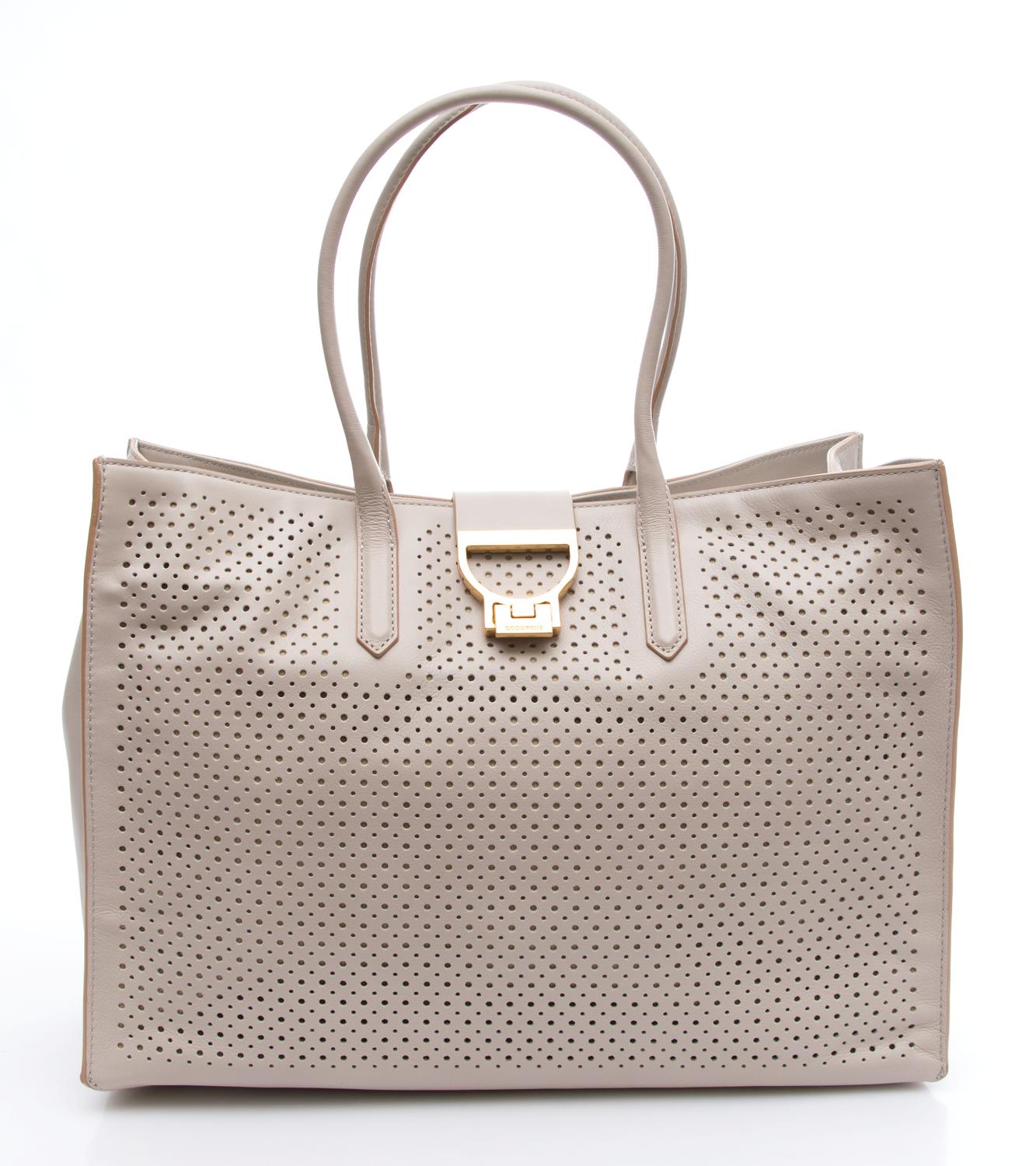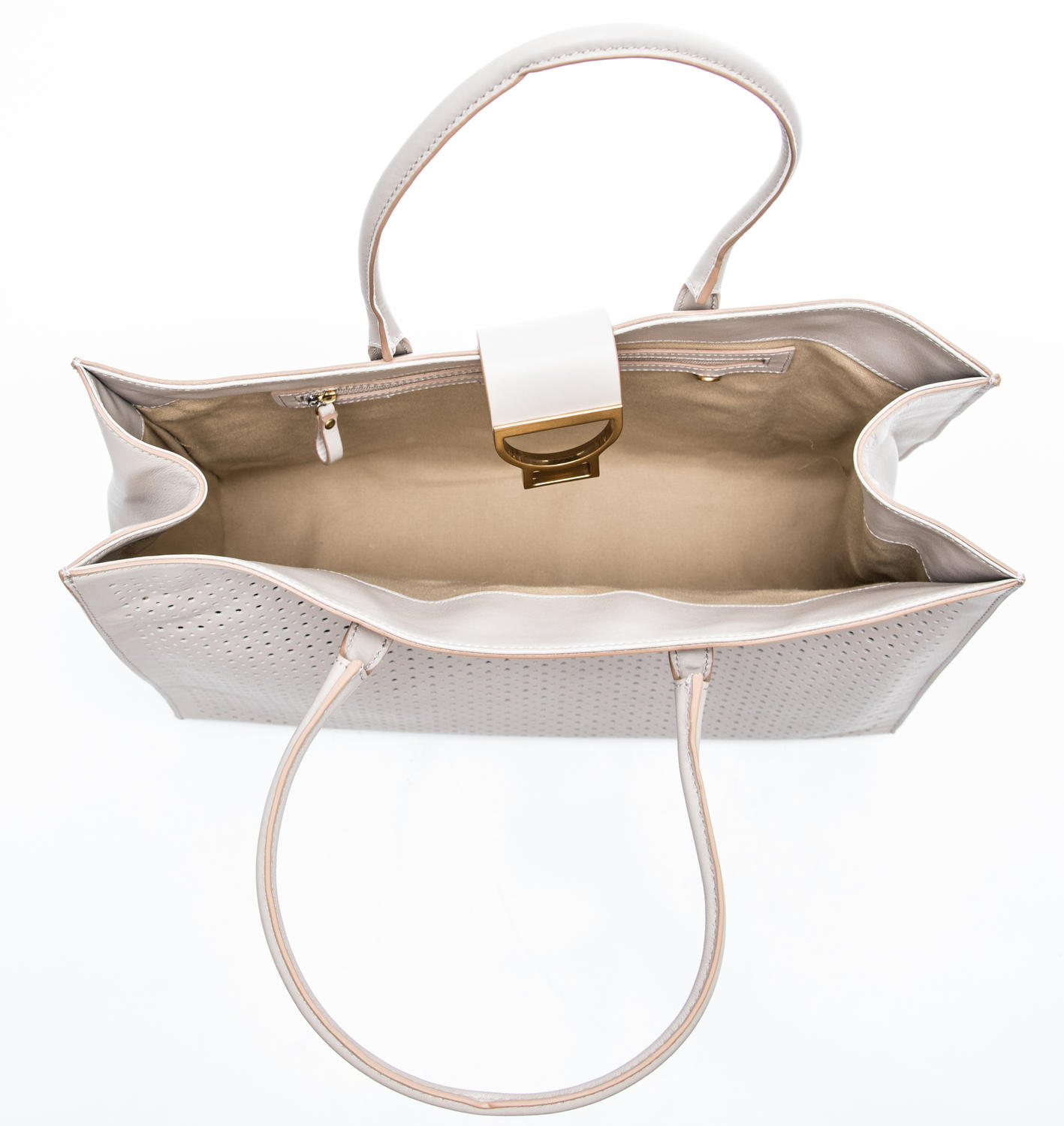 Чанта от кожа с перфориран ефект. Двойна дръжка. Закриване с клип. Вътрешен джоб с цип. Подредена платно. Ширина: 39.5 cm. Височина: 30 cm. Дълбочина: 15 cm.