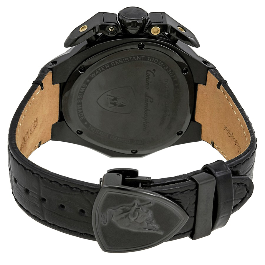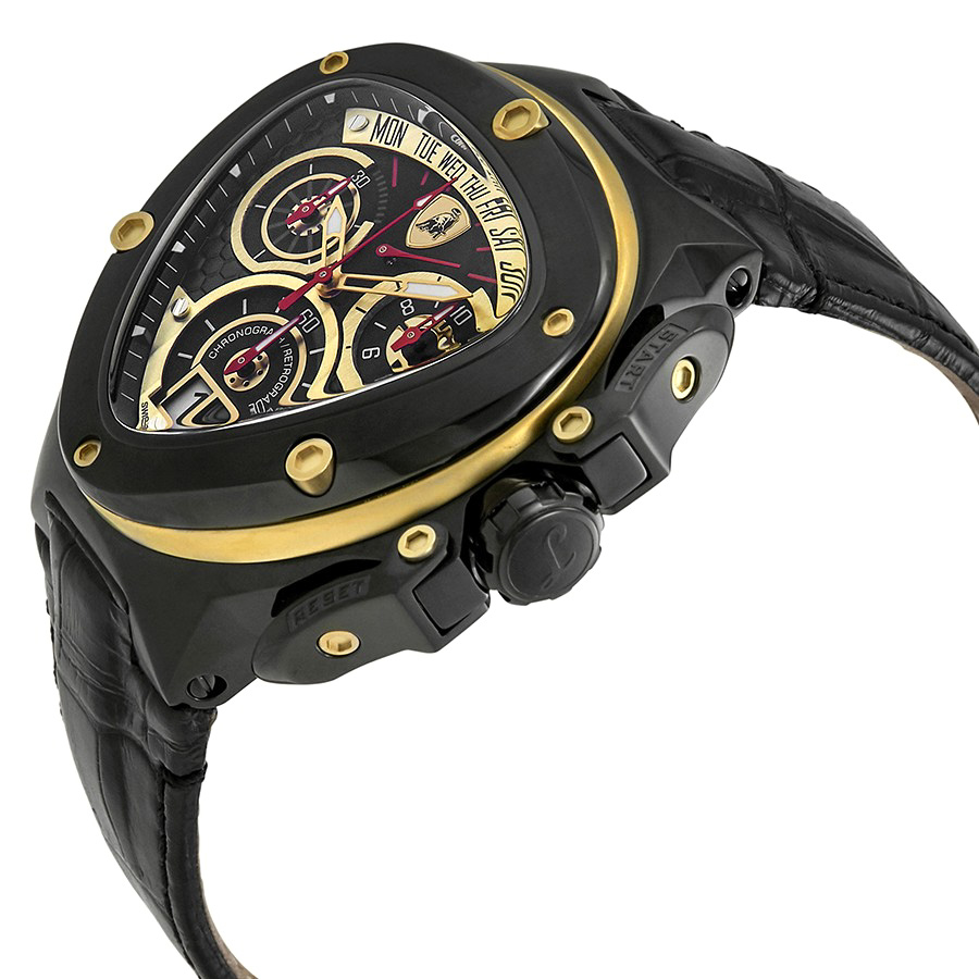 Stainless steel case with a black crocodile leather strap. Fixed black PVD stainless steel bezel. Black dial with red and gold-tone hands. Lamborghini logo marks the 12 o'clock position. Dial Type: Analog. Luminescent hands. Chronograph. Quartz movement. RL 8040.N engine. Scratch resistant sapphire crystal.